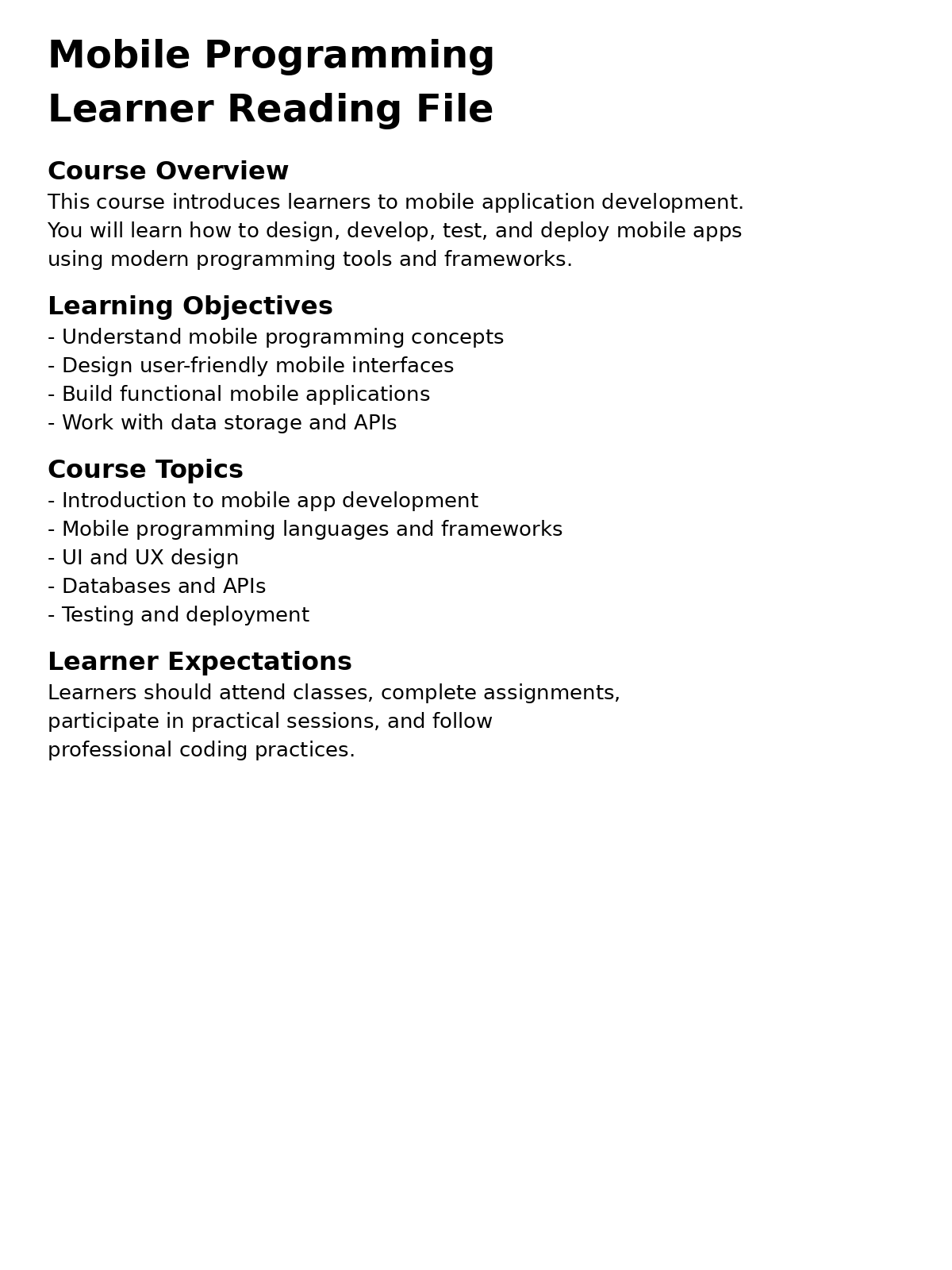 This course introduces learners to the fundamentals of mobile application development for modern smartphones and tablets. Students will learn how to design, develop, test, and deploy mobile applications using industry-standard tools, frameworks, and programming languages.